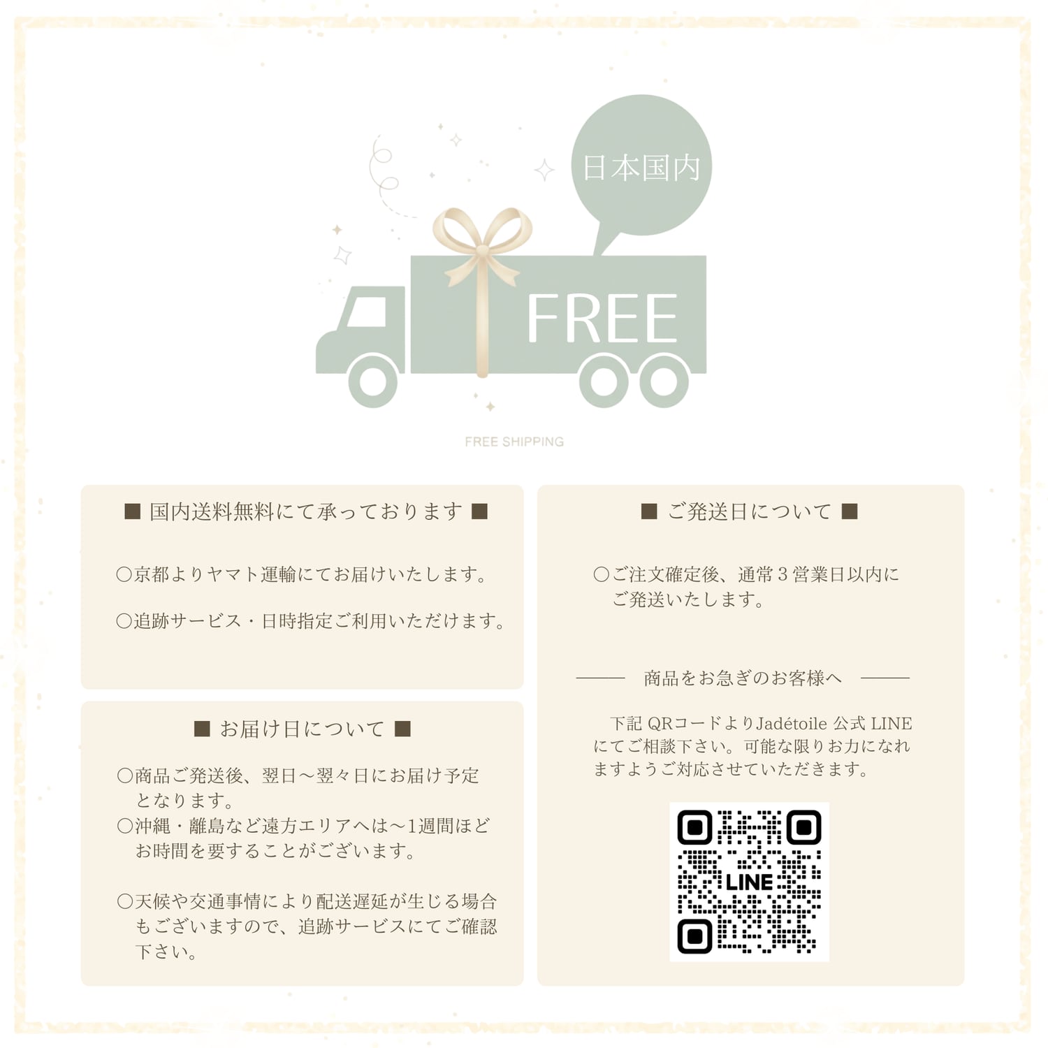 ⌘ ご不明点・ご質問などございましたら、上記のJadétoile 公式 LINE にてお気軽にご連絡ください。